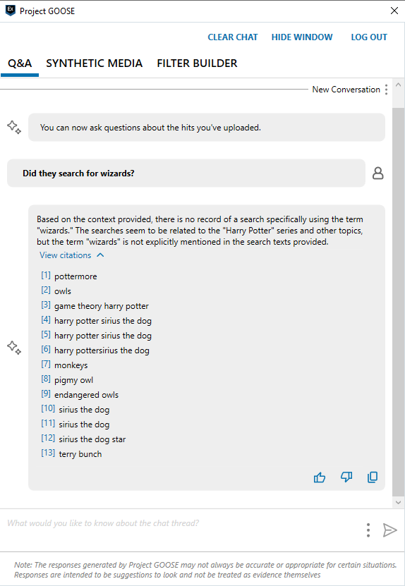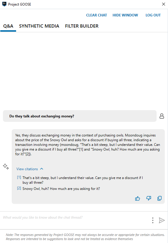 - Ask questions about your case data: the new case assistant allows you to quickly get answers to questions about chat threads and web searches in your case. Relevant results are shown in the form of citations that allow you to quickly jump into the data during your investigation. Get answers to questions such as: “Do they discuss meeting up?”, “Are there any threats of violence?”, and “Do they search for hiding evidence?”.